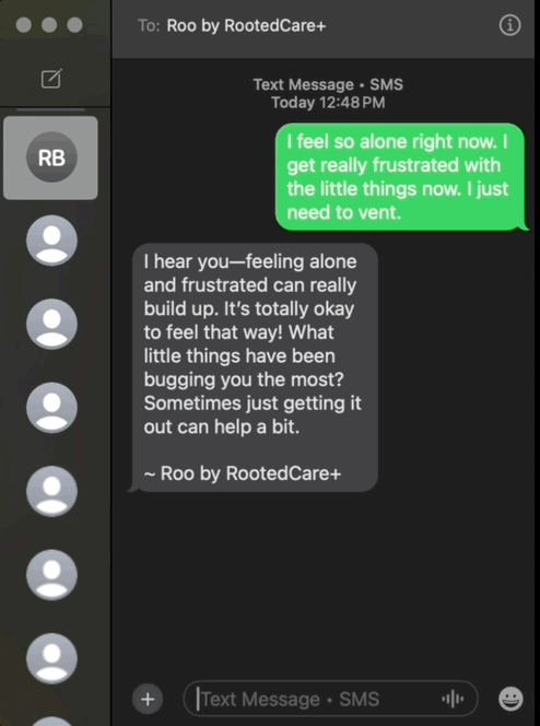 *By registering for Roo, you agree to receive recurring SMS messages from RootedCare+ offering emotional support, resources, and microgrants. Message & data rates may apply. Text HELP for help, STOP to cancel.